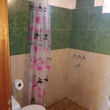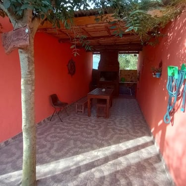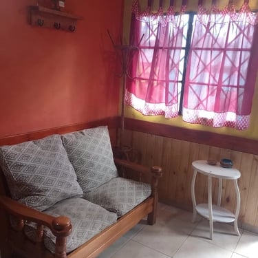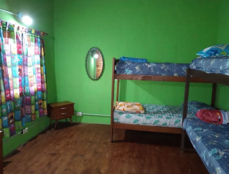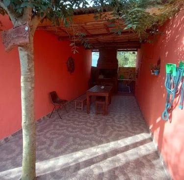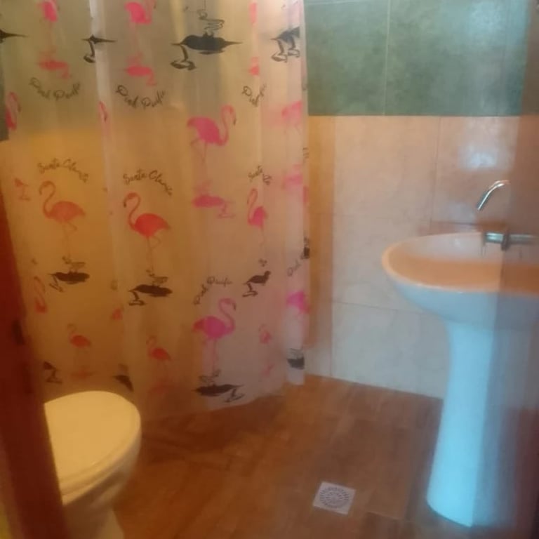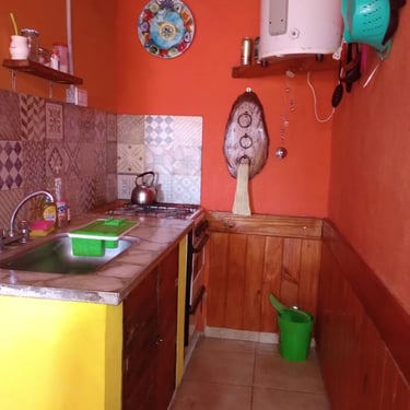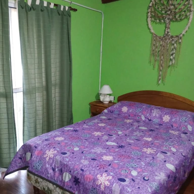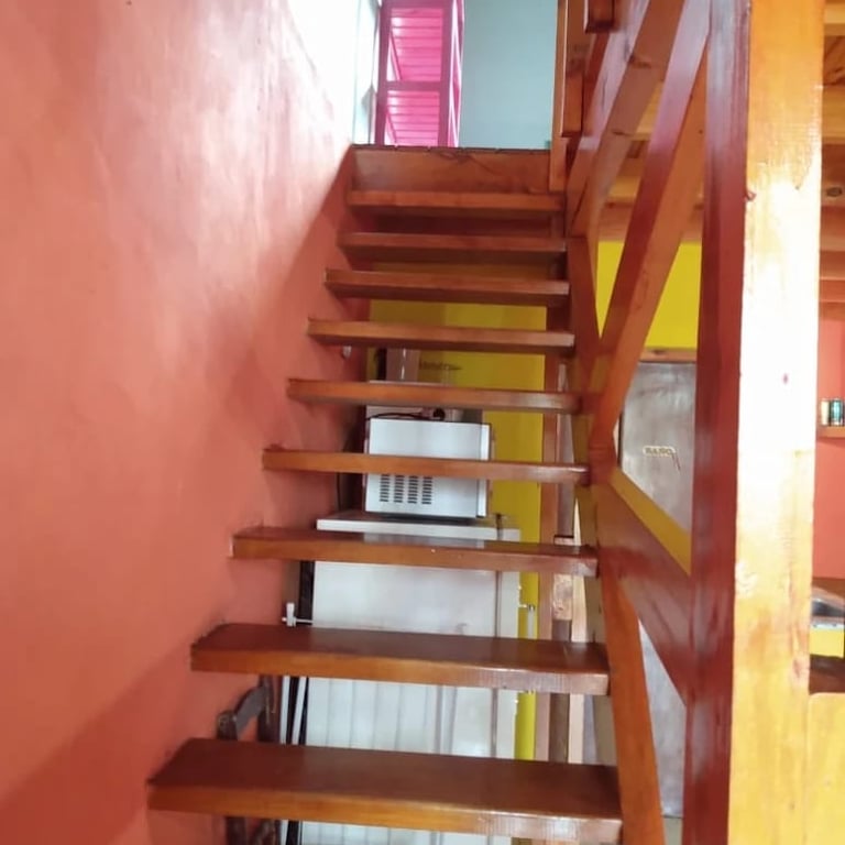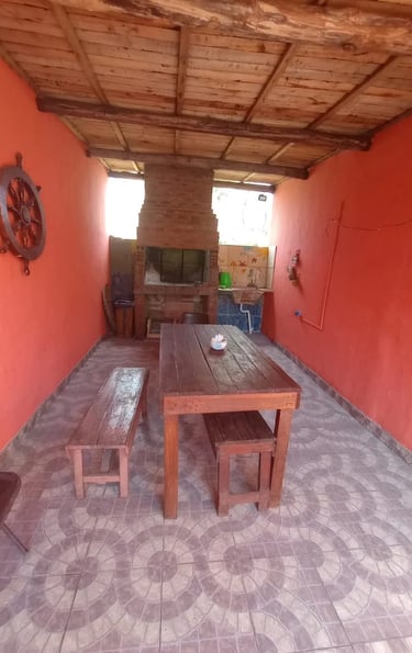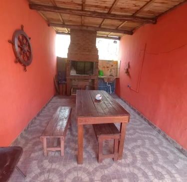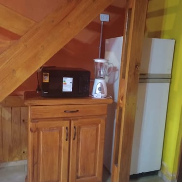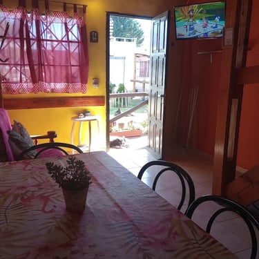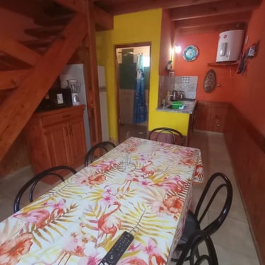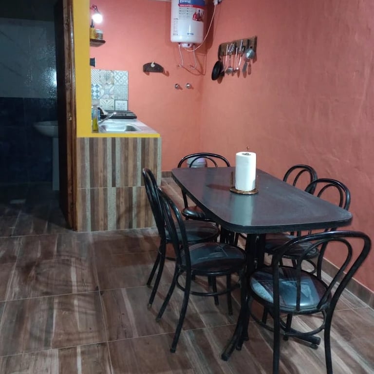 Cocina-comedor (en planta baja) equipada con vajillas, microondas, licuadora, pava eléctrica y Tv conectado a cable.